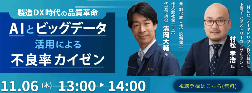 2025年11月6日(木)オンラインイベント「製造DX時代の品質革命:AIとビッグデータ活用による不良率カイゼン」に代表取締役の清岡が登壇します。