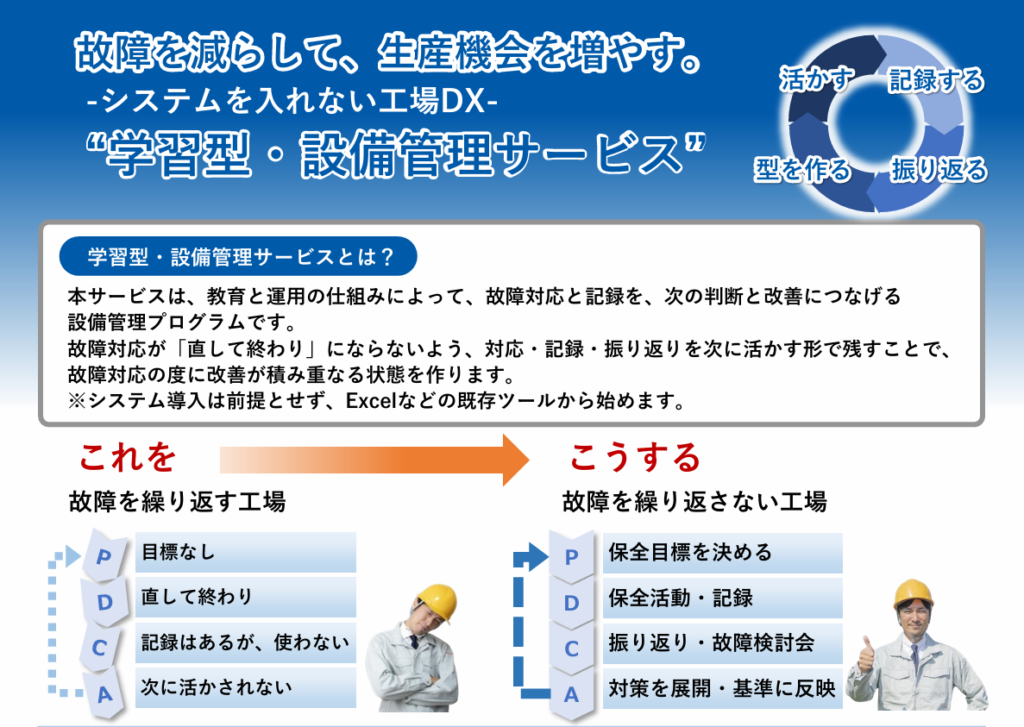 本サービスは、教育と運用の仕組みによって、故障対応・記録・振り返りを一つの流れとしてつなぎ直す設備管理プログラムです。システム導入を前提とせず、Excelなどの既存ツールを活用しながら、現場で“回る状態”を整えます。