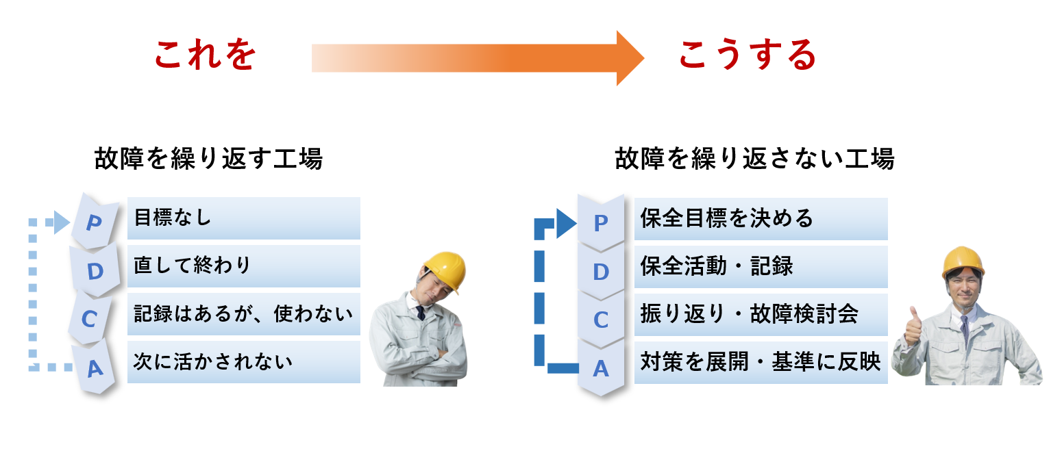 目指すは、故障対応を重ねるほど、保全スキルと改善が積み上がっていく工場です。