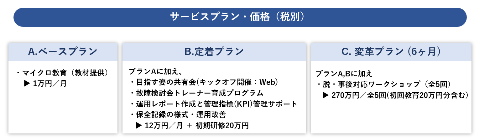 本サービスは、教育で前提と知識を揃え、記録で判断を残し、振り返りで次の打ち手を決めるという流れによって、故障対応・保全記録・対策検討を一つの改善サイクルとしてつなぎ直し、改善と知識を個人ではなく組織に積み重ねます。