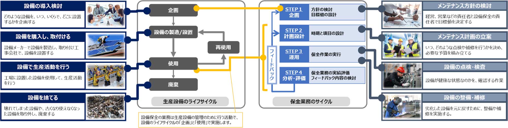 設備保全は、設備のライフサイクル(設備が生まれてから廃棄・再使用まで)を最適にするための活動です。